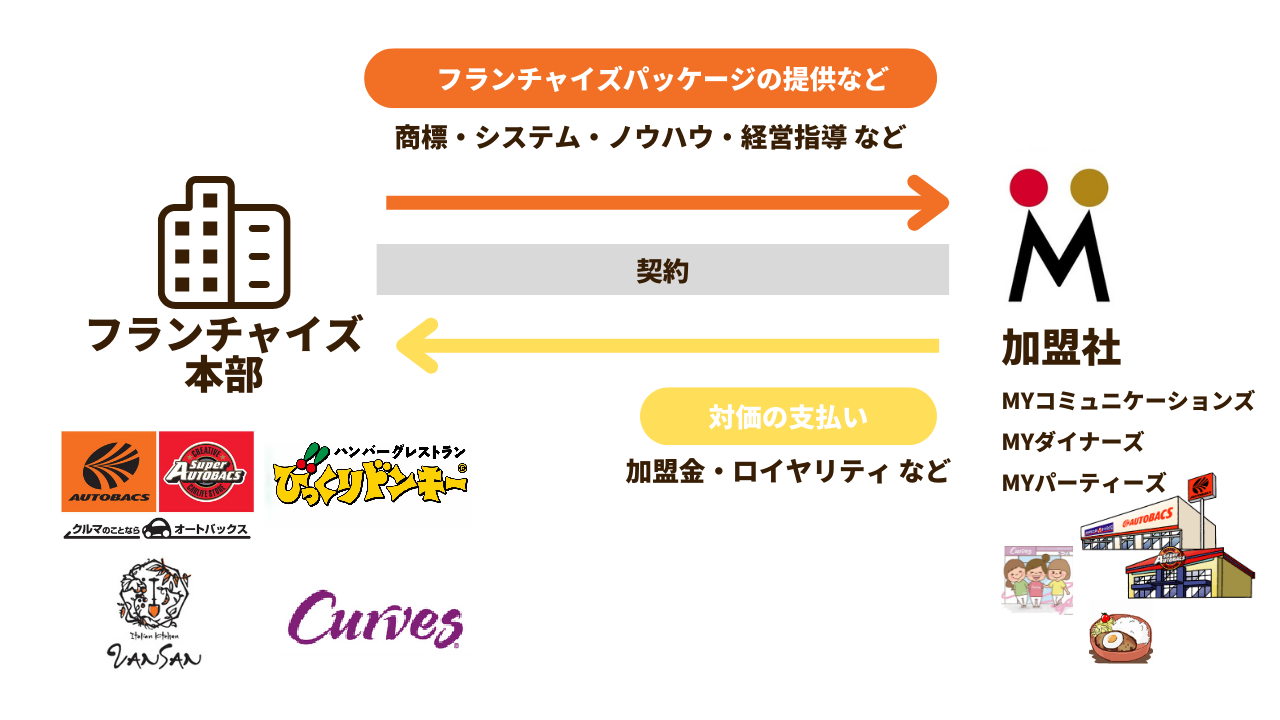 フランチャイズとは、フランチャイズに加盟する個人や法人が、フランチャイズ本部から商標・お店の看板、確立されたサービスや商品を使う権利だけでなく、ビジネスや経営のノウハウ等を提供してもらい、その対価をフランチャイズ本部にロイヤリティとして支払うという仕組みです。