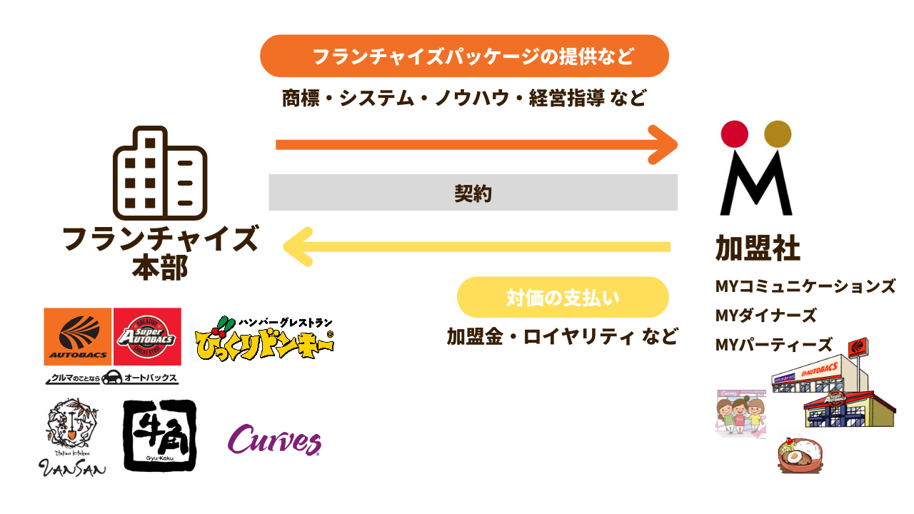 フランチャイズとは、フランチャイズに加盟する個人や法人が、フランチャイズ本部から商標・お店の看板、確立されたサービスや商品を使う権利だけでなく、ビジネスや経営のノウハウ等を提供してもらい、その対価をフランチャイズ本部にロイヤリティとして支払うという仕組みです。